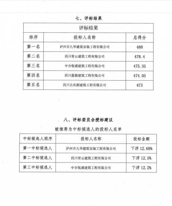 中選單位為:瀘州市九華建筑安裝工程有限公司,中選金額為:以財(cái)評總價下浮12.68%。