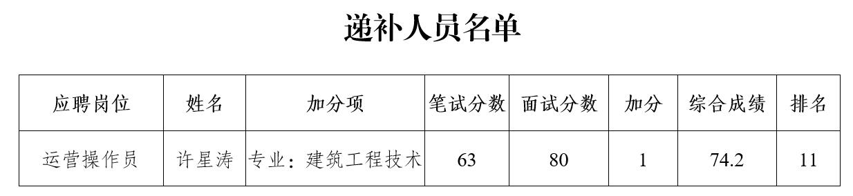 根據(jù)《瀘州阜陽(yáng)投資集團(tuán)有限公司關(guān)于合江縣城市開(kāi)發(fā)投資(集團(tuán))有限公司下屬子公司合江縣華陽(yáng)水業(yè)有限公司2020年公開(kāi)招聘工作人員的公告》的規(guī)定,按綜合成績(jī)排名,因1名擬聘用人員自動(dòng)放棄,現(xiàn)將擬聘用人員的遞補(bǔ)人員名單面向社會(huì)公示7個(gè)工作日,公示時(shí)間2020年7月8日至2020年7月16日。公示期間,如有問(wèn)題,請(qǐng)及時(shí)向?yàn)o州阜陽(yáng)投資集團(tuán)有限公司組織與人力資源管理部反映。要求舉報(bào)者署實(shí)名,實(shí)事求是地反映問(wèn)題,并提供必要的調(diào)查線索。
