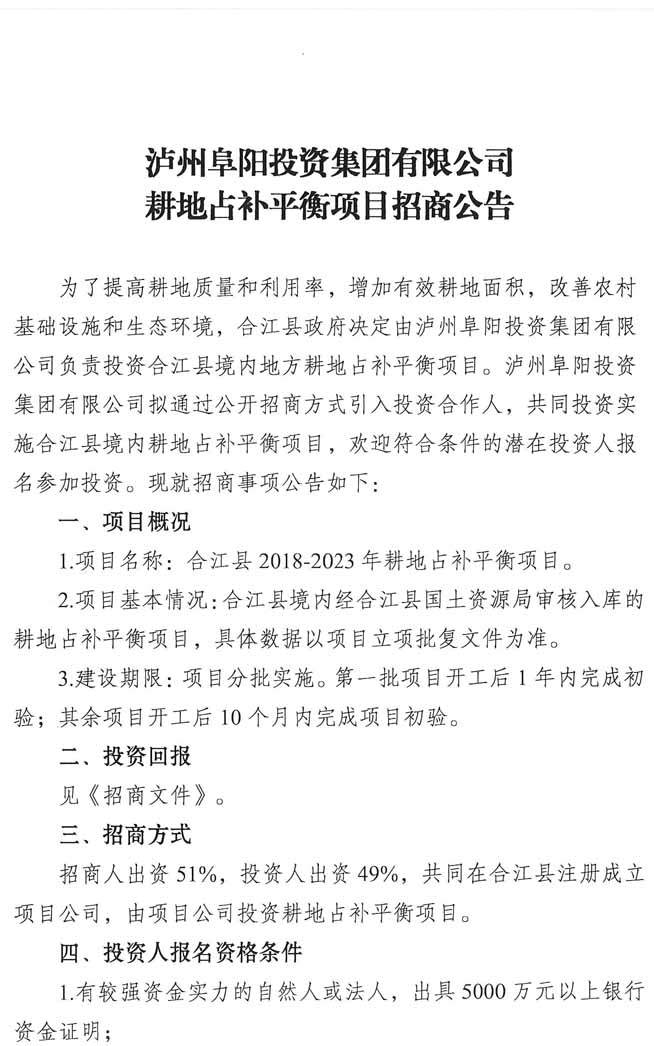 招商公告:瀘州阜陽投資集團(tuán)有限公司耕地占補(bǔ)平衡項(xiàng)目招商公告