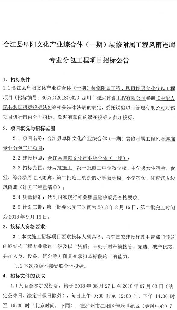 合江縣阜陽文化產(chǎn)業(yè)綜合體(一期)裝修附屬工程風雨連廊專業(yè)分包工程項目招標公告.doc