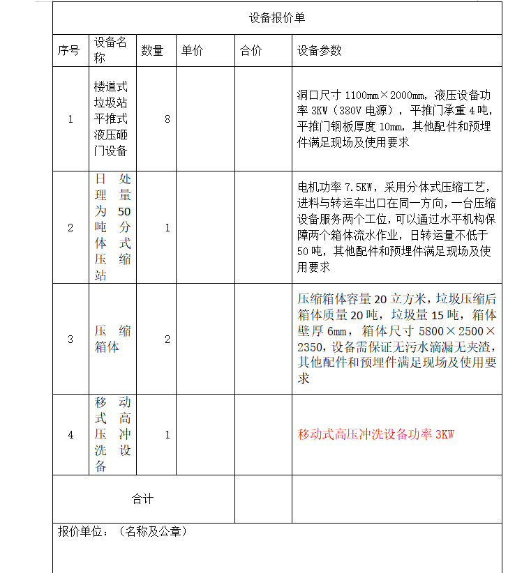 (一)樓道式垃圾站平推式液壓砸門設備:洞口尺寸1100mm×2000mm,液壓設備功率3KW(380V電源),平推門承重4噸,平推門鋼板厚度10mm,其他配件和預埋件滿足現(xiàn)場使用需求;